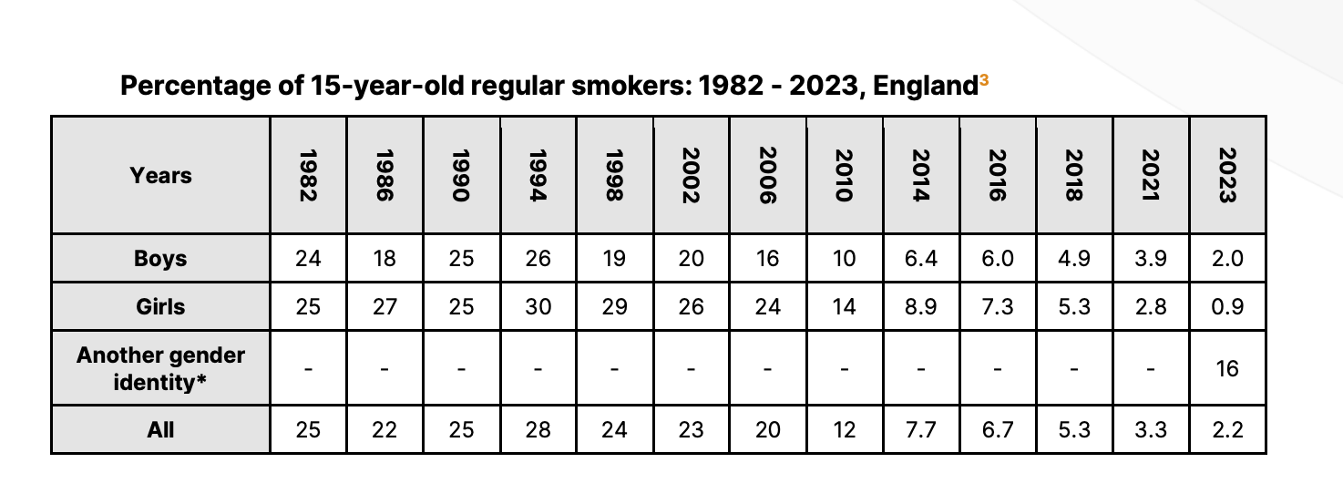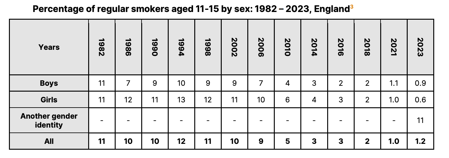When it comes to 11 to 15-year-olds, smoking has dropped considerably over the last 20 years. However, between 2021 and 2023, we see a rise from 1% to 1.2%. So, not a massive movement, but the trend has been bucked.