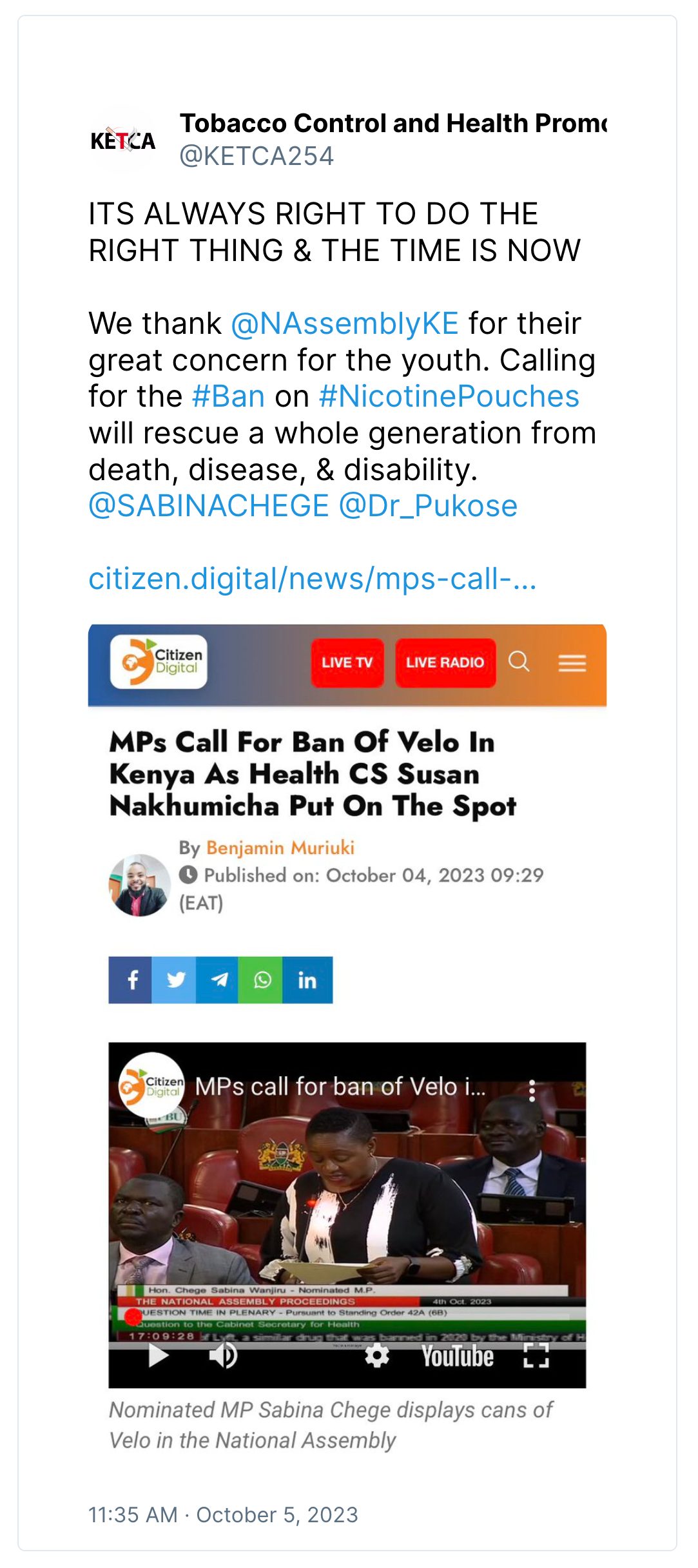 Of course, Chege's words have been seized upon by groups like the Nairobi-based Tobacco Control and Health Promotion Alliance. Instead of acknowledging that the basis for parliamentary action is about packaging, they tweeted that a nicotine pouch ban "will rescue a whole generation from death, disease, & disability."