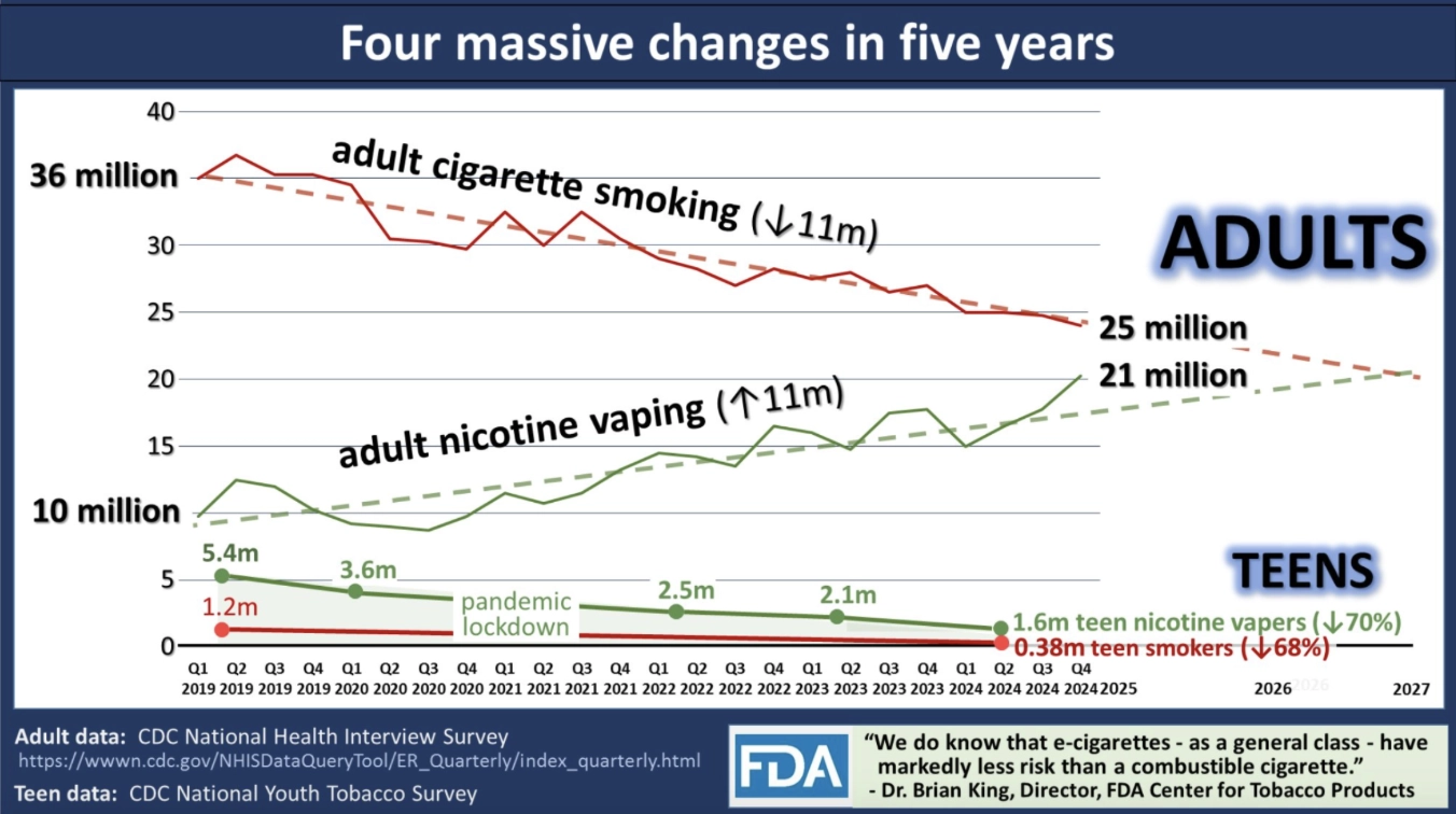 As the esteemed Charles A. Gardner shows above, US youth vaping declined dramatically between 2019 and 2024, which covers some of the years under question.