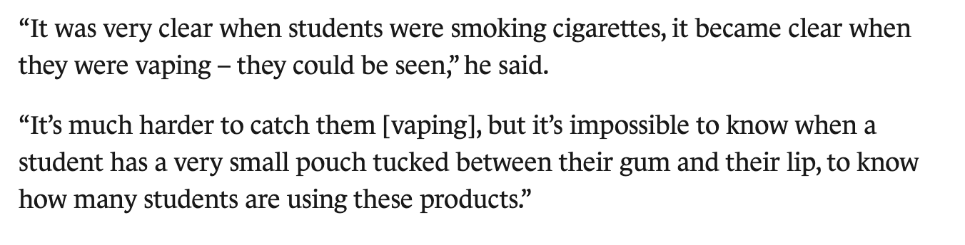 For school administrators, pouches represent a unique problem. It’s hard to argue it’s about health because each nicotine pouch user might well be a cigarette smoker in the absence of these products. Instead, it seems that one of the major objections to pouches is their discretion, which makes it hard to monitor and catch students.