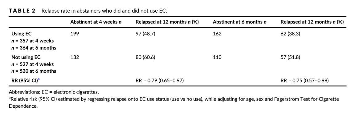 The secondary analysis looked at people who were abstinent at 4 weeks or at 6 months after their quit date, then followed up at month 12.