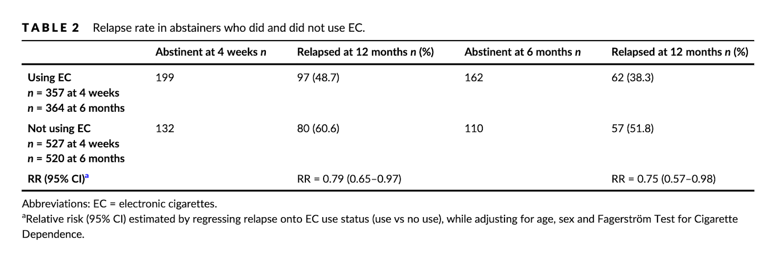 The secondary analysis looked at people who were abstinent at 4 weeks or at 6 months after their quit date, then followed up at month 12.