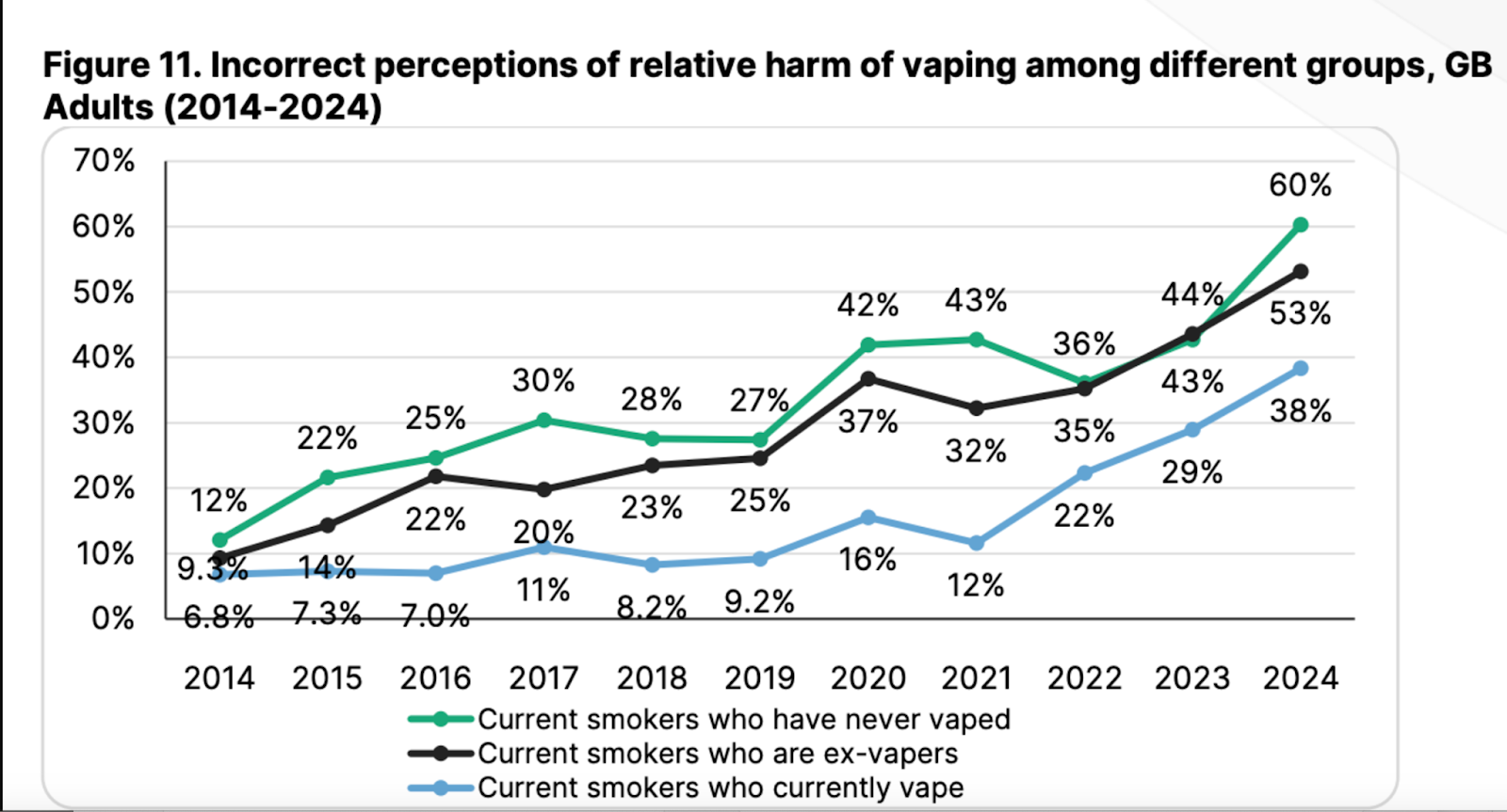 News stations and websites pumped out EVALI misinformation. The corrections — where there were any — were far quieter. As you can see from the graphic below, many current smokers were totally hoodwinked into thinking vapes were more harmful than lethal cigarettes. Ironically, the consequence of this anti-science propaganda will probably cost more lives than the original outbreak.