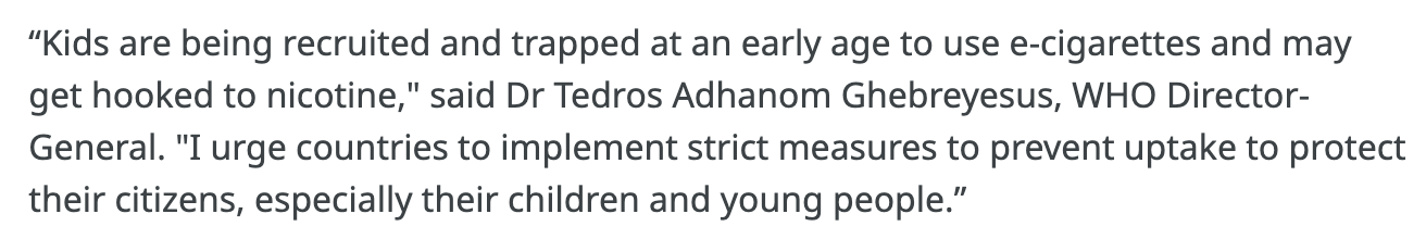 Fake doctors, like the head of the WHO, use a similar pattern when they float the thoroughly debunked and discredited idea that vaping is a gateway to smoking. Like the oddballs who didn’t like D&D or metal, they’re happy to use kids as pawns in their weird theatre.