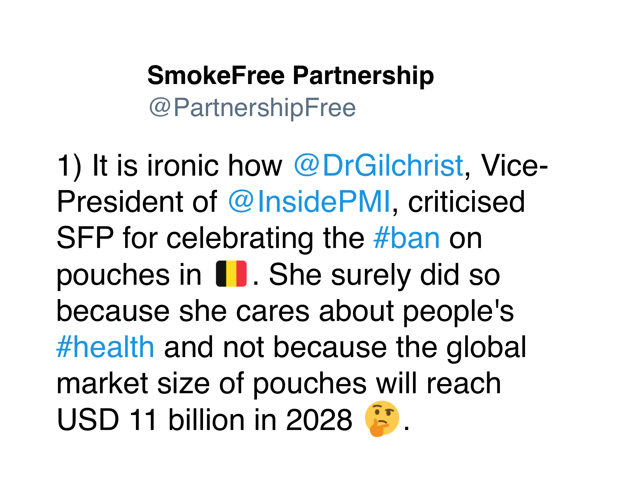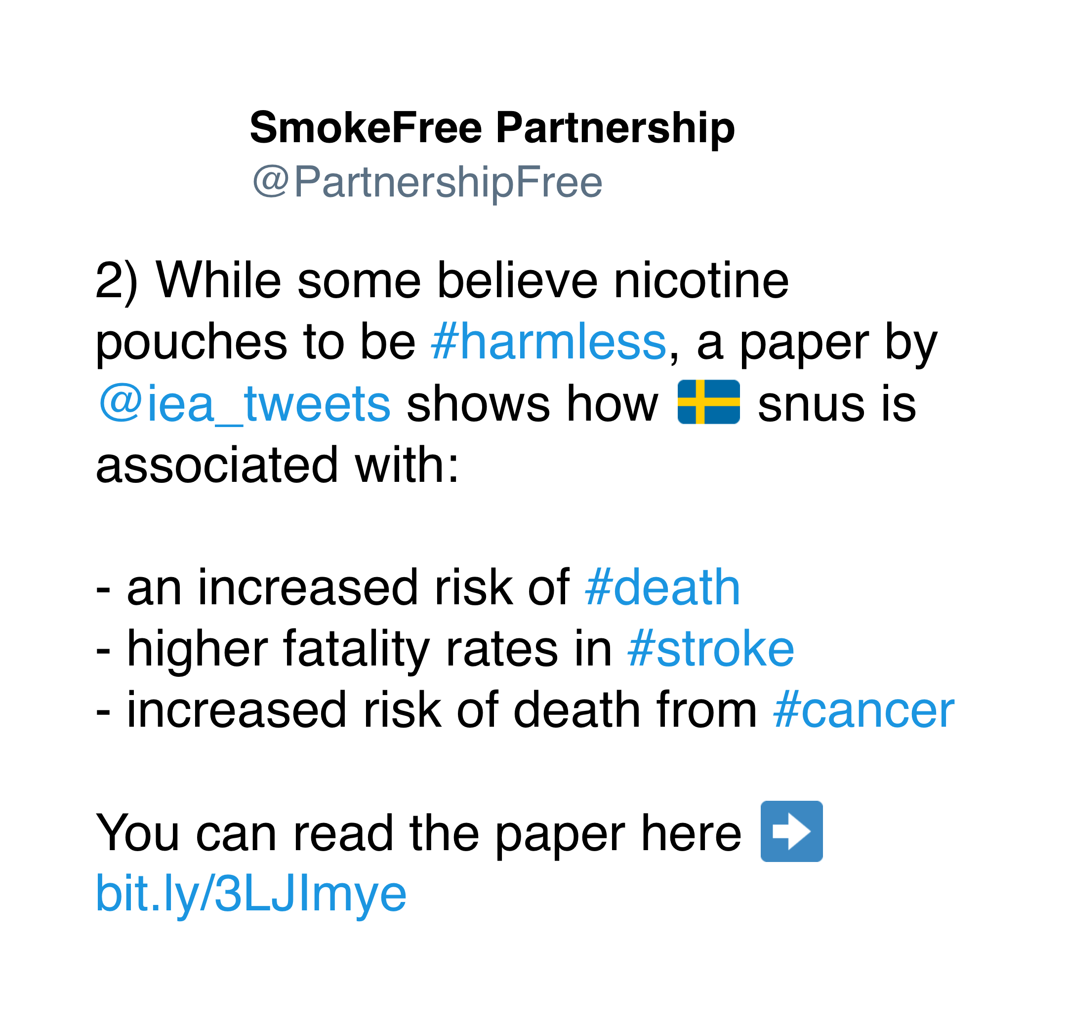 What’s obviously more embarrassing here is that they counter the strawman argument that “some people believe nicotine pouches to be harmless” with a widely criticised paper about snus. They are different products which Smokefree Partnership should know.